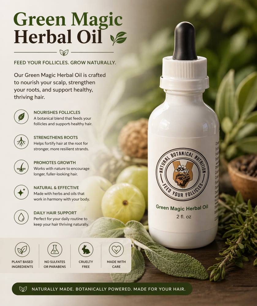 Whether you are giving extra attention to your edges, showing care to areas that feel sparse, or simply adding moisture back into your routine, Green Magic Herbal Oil brings a rich, intentional touch to everyday hair care.